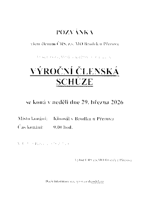 Výroční členská schůze se koná v neděli 29.03.2026 v 9,00 hod. v kinosále v Brodku u Přerova.